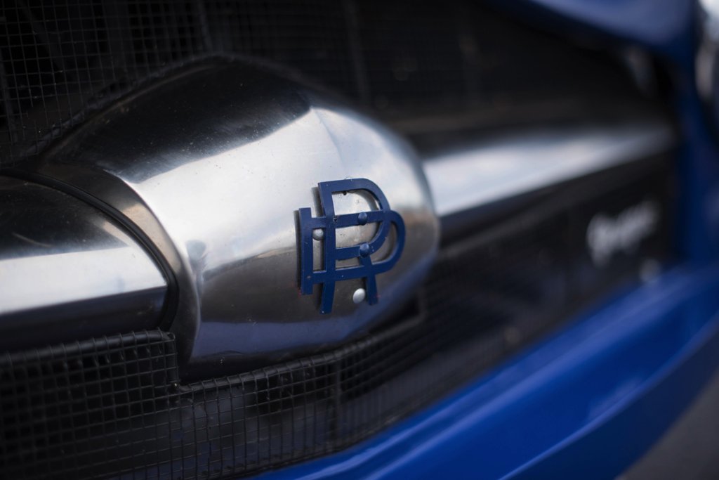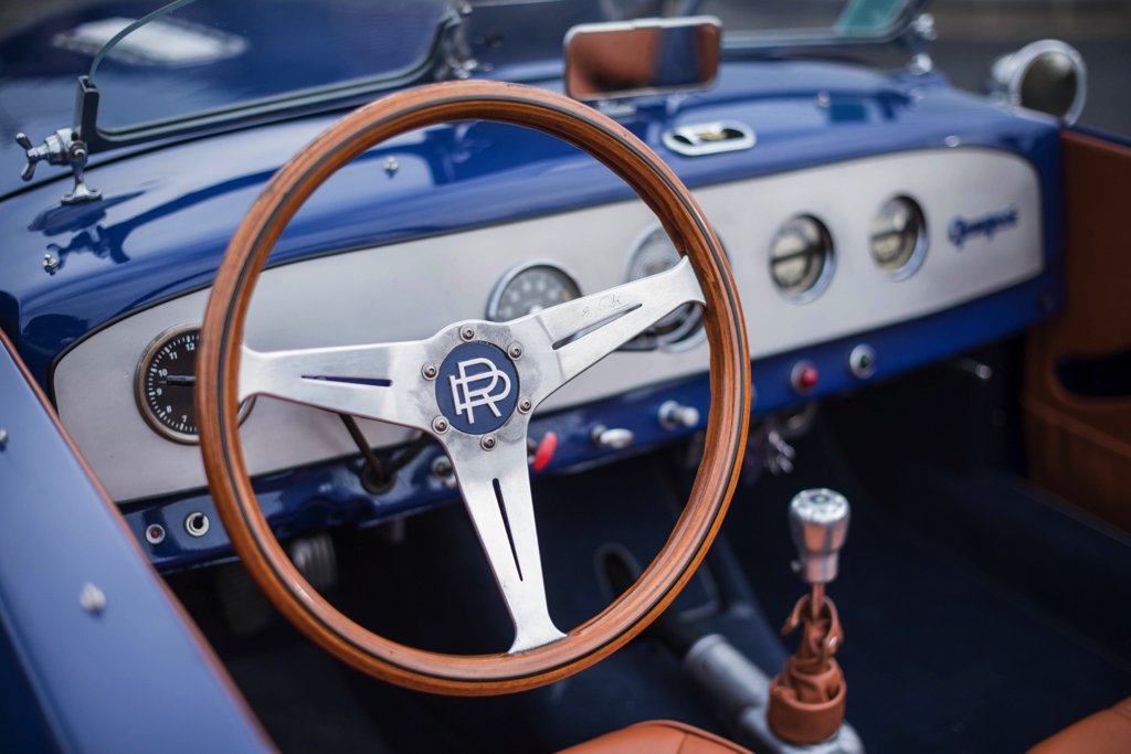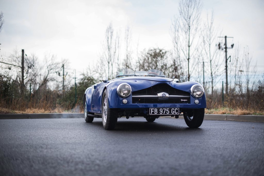 The grille appears to come from a Ford Vedette Vendôme and bears the designer’s initials, RG. The car stands on Robergel spoke rims, equipped with the Roger Dillmann butterfly.