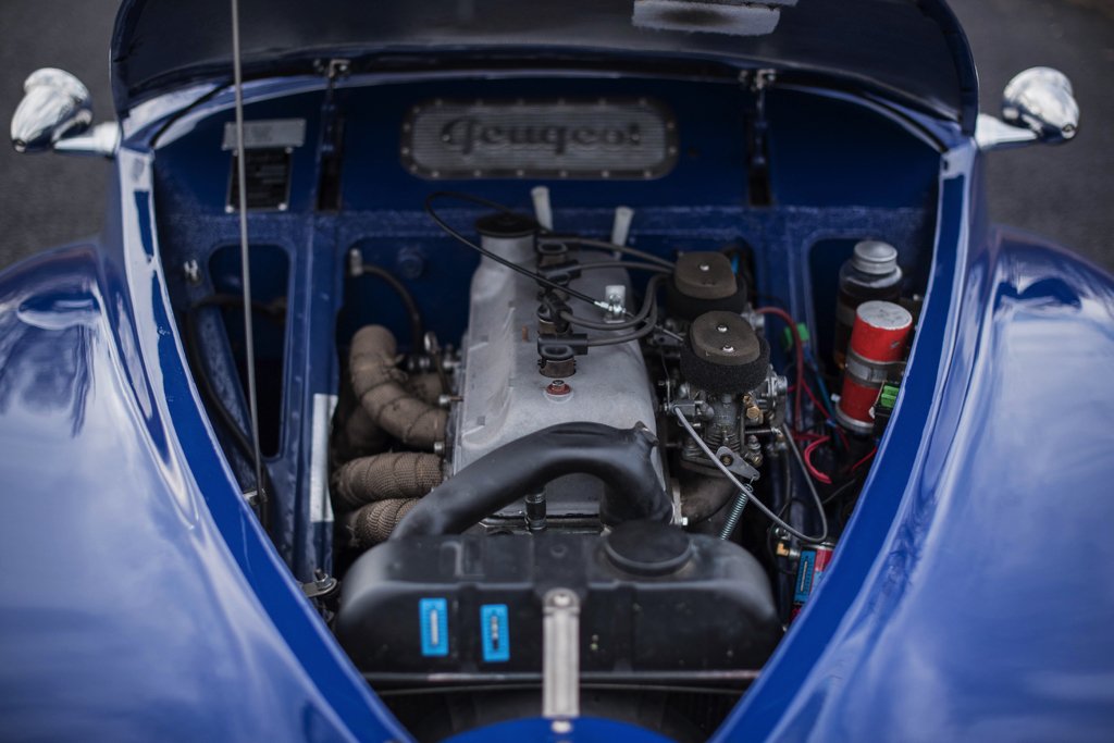 Under the hood is an 8 CV engine from the Peugeot 403. Various adjustments have been made compared to the standard version of the engine, such as the pistons, camshaft, 2 Solex 32 PBIC carburetors and a Constantin compressor.