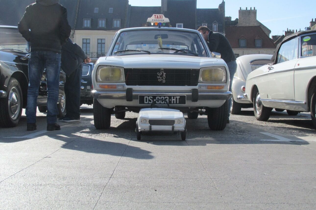 Imagine: an impressive, stately Peugeot 504 next to a cute 504 in the shape of a pedal car. Both neatly parked and ready for adventure!