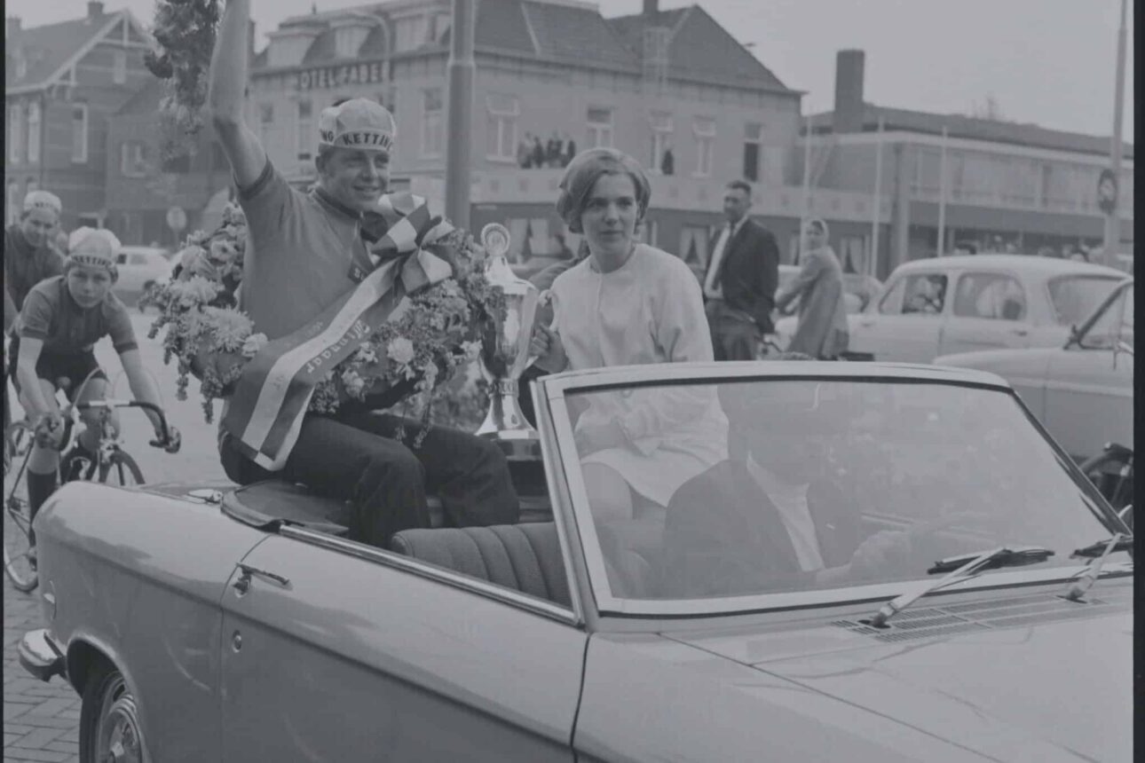 In the photo we see cyclist Frits Schür nicknamed De Lip. He was honored on 15 May 1970 in his hometown of Hoogezand, sitting in a Peugeot 204 with fiancé Janny Harms.